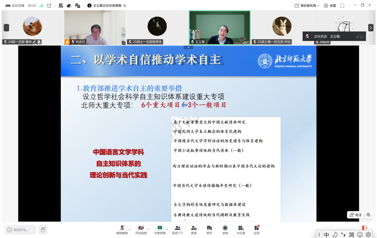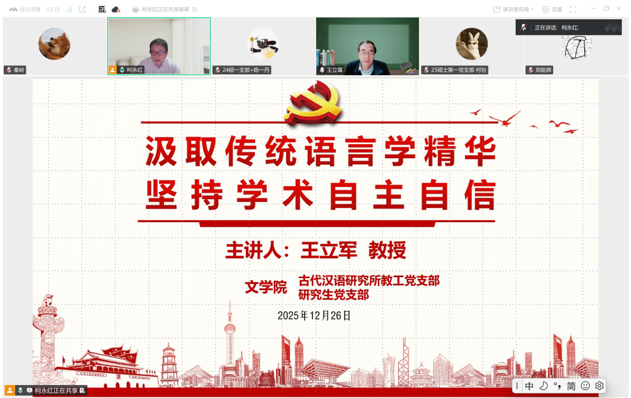 古代汉语研究所教工党支部与研究生党支部联合开展共建活动,邀请古代汉语教师党支部的王立军老师主讲线上党课——“汲取传统语言学精华,坚持学术自主自信”。活动由古代汉语研究所教工党支部书记柯永红老师主持,来自2023级、2024级、2025级的70余名硕士研究生党员和入党积极分子共同参加了此次党课学习。