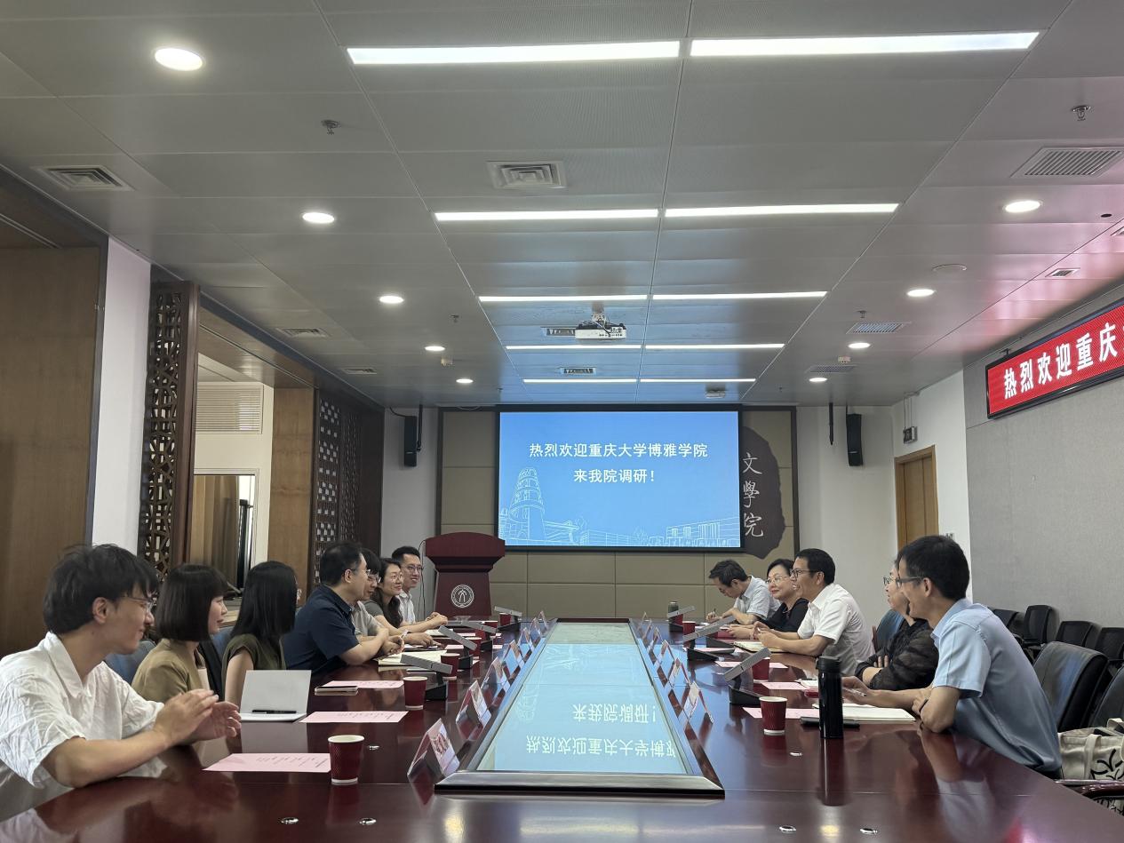2025年6月5日上午,重庆大学博雅学院副院长(代院长)李广益、中文系主任金浪、支部书记万曼璐、中文系副主任肖馨瑶、科研秘书罗宇、中文系学科秘书张振、崔文骏一行7人前来免费成人直播 调研。交流会由书记周云磊主持。