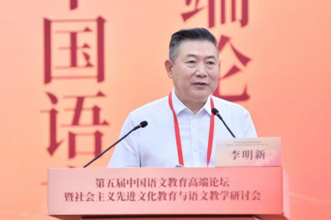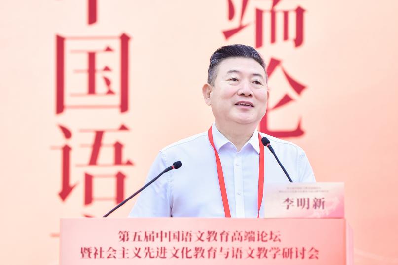 北京小学校长、教育部基础教育教学指导委员会语文专委会主任委员李明新在致辞中强调,本届论坛聚焦社会主义先进文化教育,对落实教育强国建设具有重要意义。他指出,语文教育兼具工具性与人文性,肩负着以文化人、培根铸魂的使命。为推动语文教育更好服务于教育强国建设,他提出五点要求:高扬爱国主义主旋律;统筹社会主义先进文化与中华优秀传统文化、革命文化教育;准确把握新课标对先进文化的呈现;创新数字化时代的阅读教学;促进语文与思政、历史等学科融合。最后,他号召语文教育工作者要勇担使命,为社会主义现代化强国建设提供不竭的精神动力。
